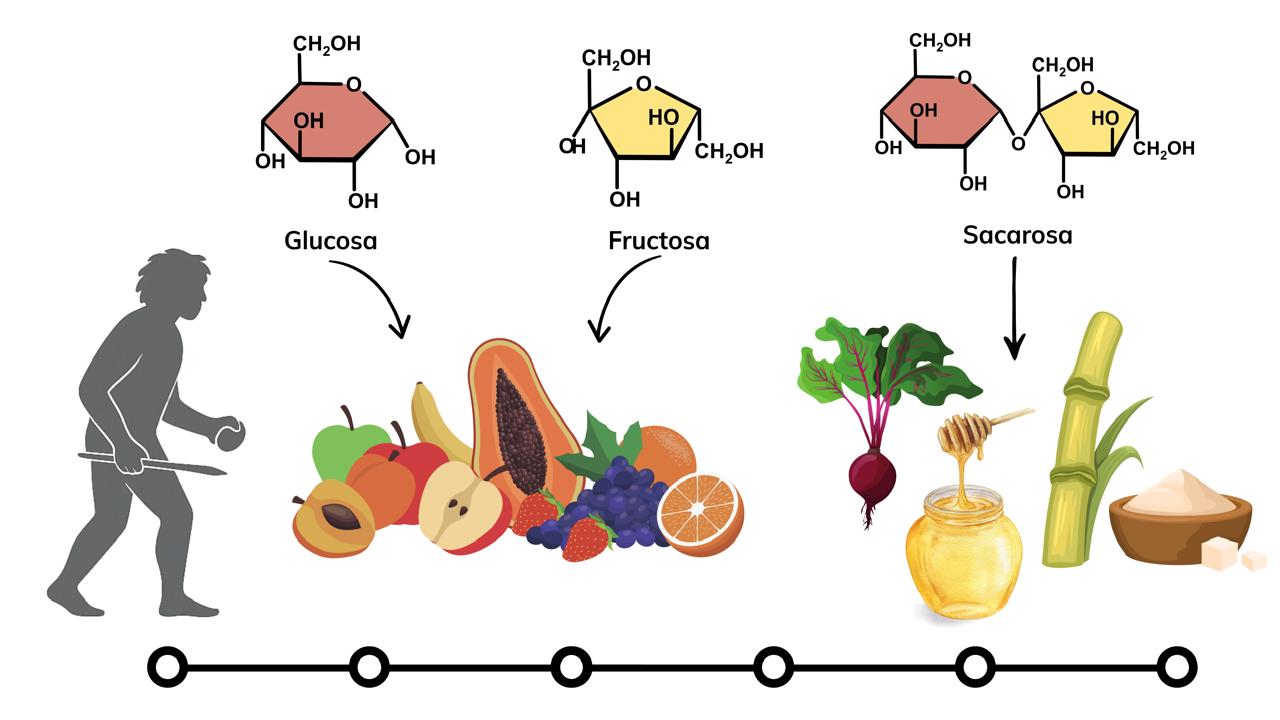 Figura 1. Origen natural de los azúcares. En la dieta humana temprana, la glucosa, la fructosa y la sacarosa fueron señales de alimento seguro para los primeros Homo sapiens. Apenas en el siglo pasado, la glucosa y la fructosa se empezaron a producir también industrialmente mediante un proceso biológico a partir del almidón del maíz, los llamados jarabes fructosados que en realidad son una mezcla de glucosa y fructosa.