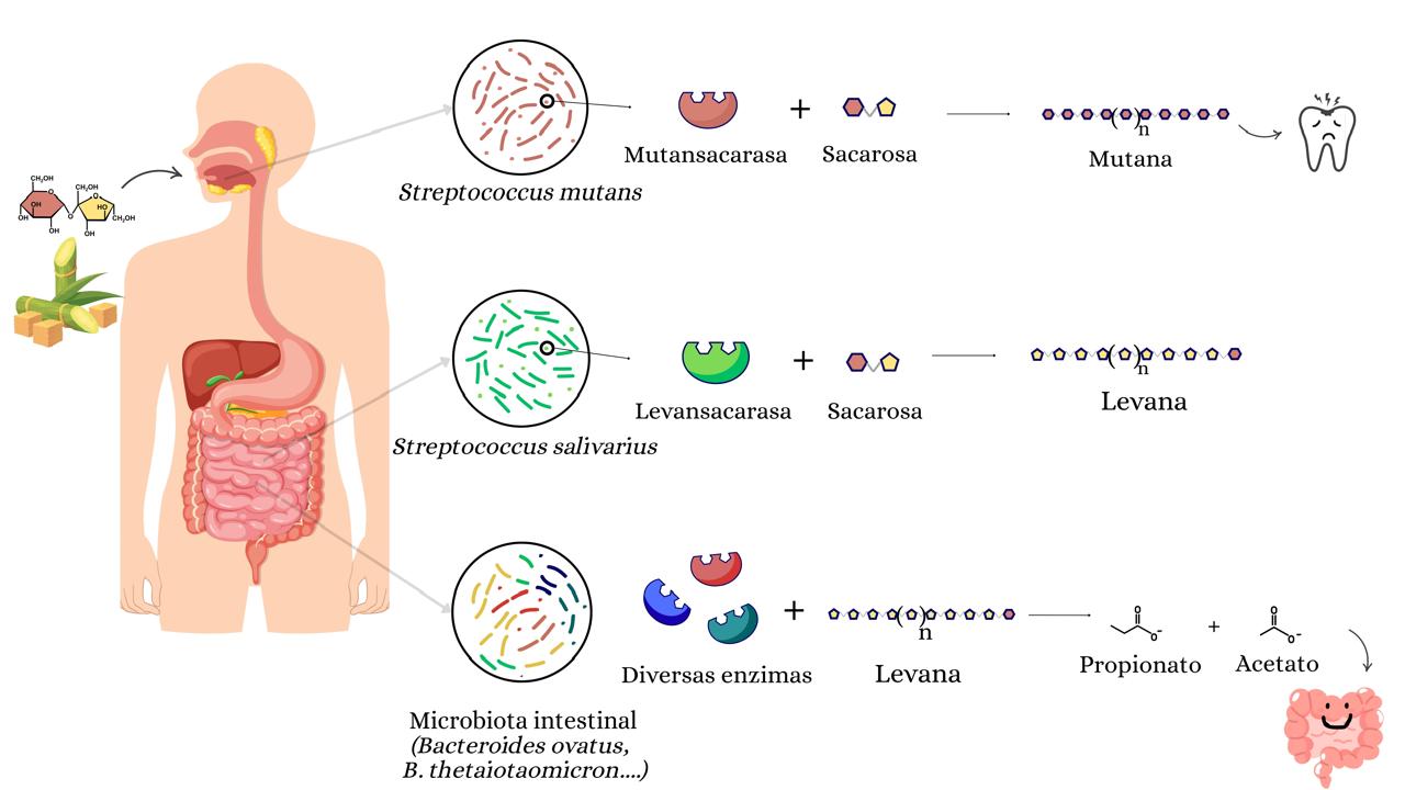Figura 2. En la boca, S. mutans convierte a la sacarosa de la dieta (dulces principalmente) en mutana, promotora de caries. La sacarosa que “sobrevive” llega al intestino, donde es hidrolizada por nuestras enzimas en glucosa y fructosa que rápidamente se asimilan como fuente de energía. Pero se ha descubierto que parte de esa sacarosa puede ser convertida por Streptococcus salivarius en levana, fibra asimilada posteriormente por Bacteroides de la microbiota intestinal generando metabolitos (postbióticos) de beneficio para el hospedero, es decir, nosotros.