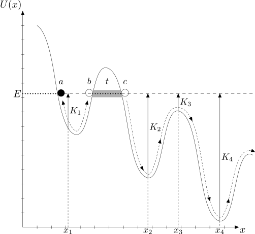 Figura 2. Gráfica de la energía potencial U de algún sistema como función de su configuración x. Se ilustra con una línea horizontal (a trazos en unas regiones y punteada en otras) una posible energía total E. La diferencia entre ésta y la curva U(x) es la energía cinética K correspondiente a la configuración x la cual se ilustra para algunas configuraciones xᵢ con flechas verticales. El sistema podría estar atrapado entre las configuraciones a y b, conocidas como puntos de retorno. Con la misma energía, si el sistema estuviera en la configuración c podría evolucionar hacia la derecha sin detenerse ni regresar. Se muestra con una línea sombreada un túnel t entre b y c.