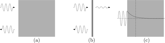 Figura 4. La luz visible que incide en un metal (a) es totalmente reflejada pues no se puede propagar en su interior, pero si incide en una película suficientemente delgada (b) se puede transmitir un poco, pues en el interior de la lámina delgada sí existe un campo electromagnético, pero es evanescente, como en (c).