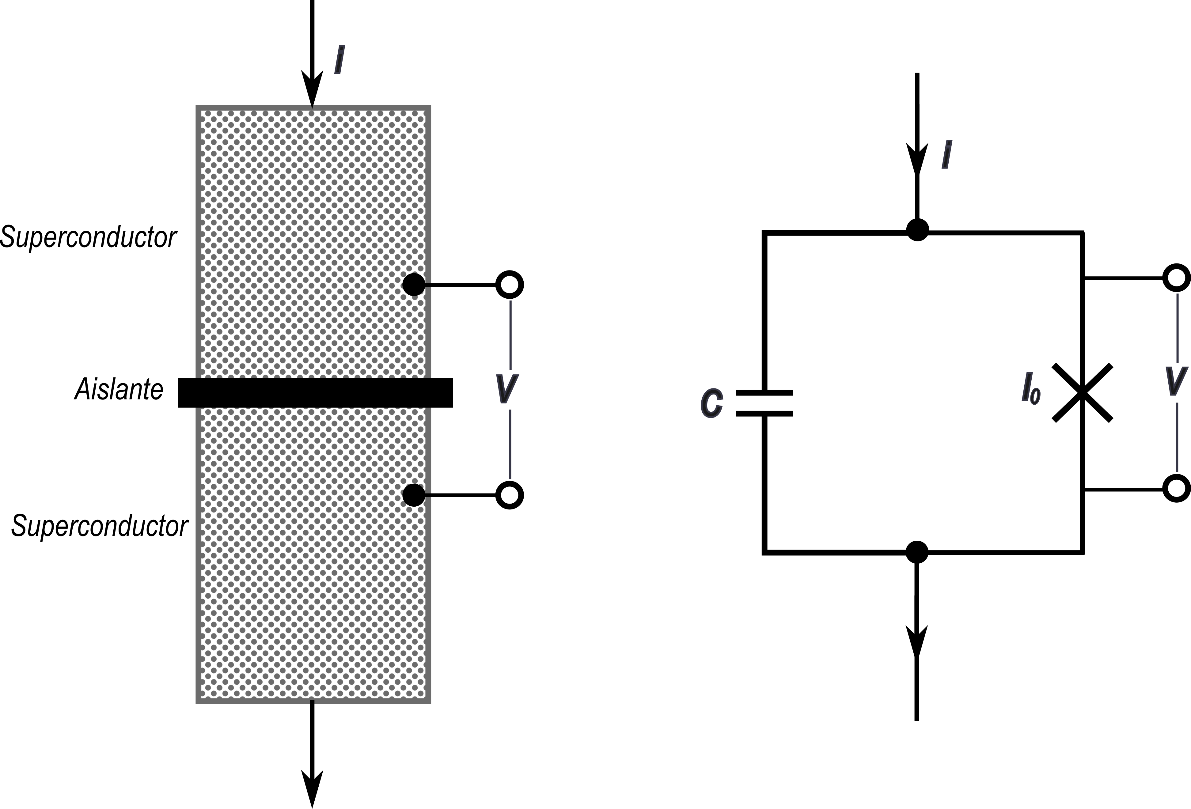 Figura 6. Izquierda: diagrama esquemático de una unión de Josephson. El paso de la corriente I a través de la unión se puede controlar de tal forma que los pares de Cooper pueden pasar del superconductor de arriba al de abajo sin generar una diferencia de potencial V (partícula atrapada). Una vez que la corriente aplicada alcanza un valor crítico I0, se produce una diferencia de potencial medible (partícula en movimiento). Derecha: circuito eléctrico equivalente a la unión de Josephson. Dicho circuito posee una capacitancia intrínseca C, debido a que la unión está formada por dos electrodos separados por una barrera aislante formando naturalmente un condensador eléctrico. La unión de Josephson es representada por el símbolo en forma de cruz en el circuito eléctrico.