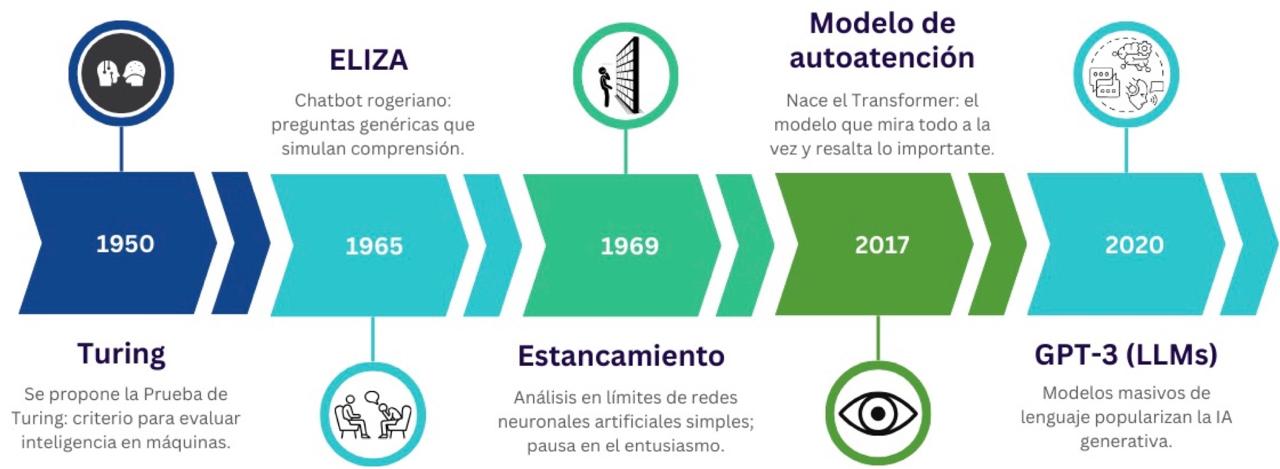 Figura 1. Línea del tiempo de acontecimientos históricos clave para el desarrollo de los modelos de lenguaje modernos.