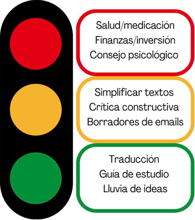 Figura 4. Recomendaciones para la identificación de usos de riesgo (rojo), usos neutrales que requieren de verificación humana (amarillo), y usos constructivos que pueden apoyar el flujo de trabajo o estudio del usuario (verde).