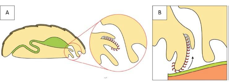 Figura 2. La rádula de los quitones. A, localización de la boca en un quitón, mostrando en expansión la rádula con los dientes. B, la acción de raspado que ejercen los dientes. Figura tomada de la referencia 2.
