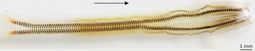 Figura 4. El color de los dientes en la rádula de los quitones. La flecha va en dirección al borde de la boca. Figura tomada de la ref 2.