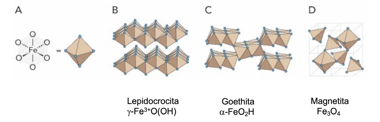 Figura 5. Estructura cristalina de los óxidos de hierro presentes en los dientes de C. articulatus. A, geometría octaédrica del hierro; B, lepidocrocita; C, goethita; D, magnetita. Los átomos de oxígeno se representan con esferas azules, mientras que el hierro se localiza en el centro de cada poliedro (se omiten los átomos de hidrógeno. Figura adaptada de la referencia 5.