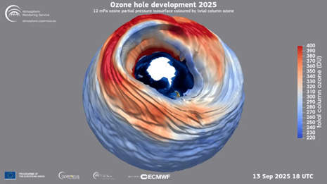Figura 1. Disminución del tamaño en el agujero de la capa de ozono. Fuente: https://www.nature.com/articles/d41586-025-03505-7