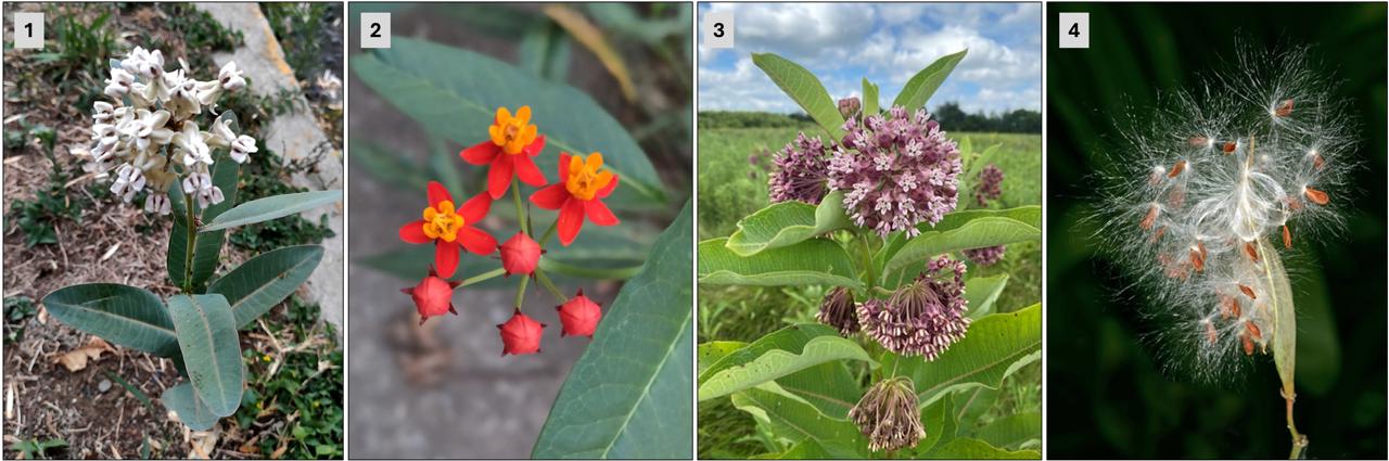 Figura 1. Diferentes tipos de algodoncillos. 1, Asclepias glaucescens (www.inaturalist.org/taxa/158740-Asclepias-glaucescens) y 2, Asclepias curassavica (www.inaturalist.org/taxa/75602-Asclepias-curassavica), comunes en México (fotos de la autora). 3, Asclepias syriaca (www.inaturalist.org/taxa/47911-Asclepias-syriaca), habitante de los Estados Unidos y Canadá. Su nombre se deriva de la forma de las semillas (4), semejantes al algodón. Las fotos 3 (www.inaturalist.org/photos/99923276 (c) csozanne) y 4 (www.inaturalist.org/photos/73195372 (c) SAplants) fueron tomadas de iNaturalist.