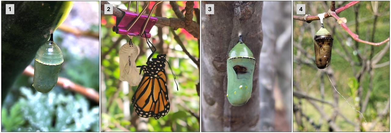 Figura 3. Mariposas monarcas en mi jardín. 1, Crisálida sana. 2, Mariposa recién eclosionada. 3, Crisálida parasitada. 4, Crisálida muerta con un hilo de seda indicativo de parasitismo por una larva de mosca. Fotos de la autora.