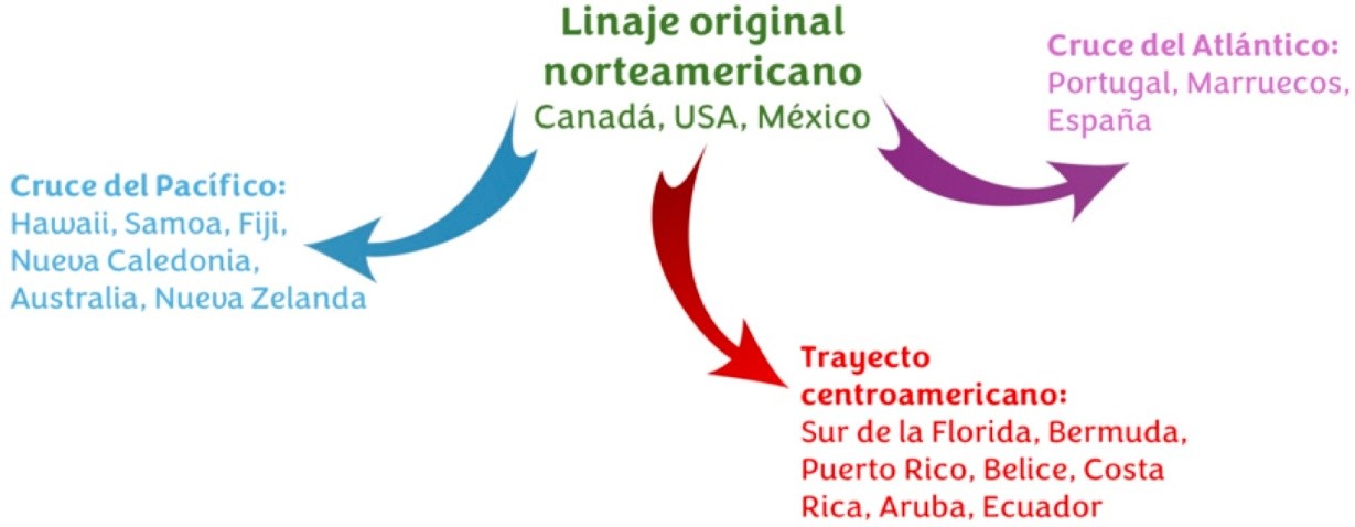 Figura 2. Tres trayectorias que han permitido el establecimiento de colonias anuales de monarcas en casi todo el mundo, a partir del linaje original norteamericano.