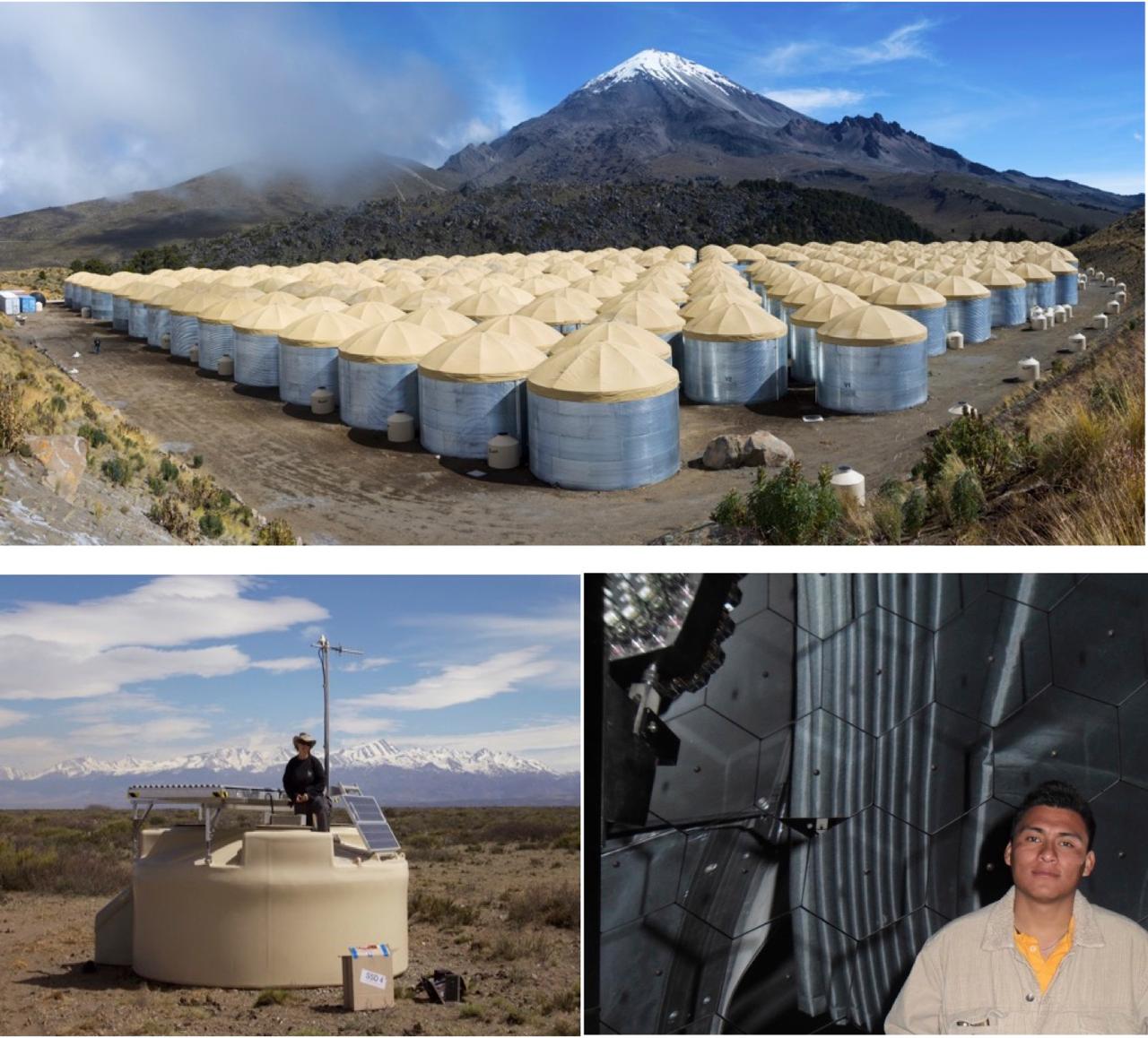 Figura 2. Superior, el observatorio HAWC, donde cada tanque puede almacenar aproximadamente 200,000 litros de agua purificada. Estos tanques tienen un diámetro de 7.3 metros y una altura de 4.5 metros (Crédito de la imagen J. Goodman, Nov. 2016) [3]. Abajo Izquierda, uno de los detectores de superficie del Observatorio Pierre Auger. Estos tanques cilíndricos están equipados con paneles solares, antenas y sistemas de registro autónomos para detectar las partículas secundarias que llegan a nivel del suelo tras la colisión de rayos cósmicos de ultra alta energía con la atmósfera. Al fondo se observa la cordillera de los Andes. Imagen obtenida de: