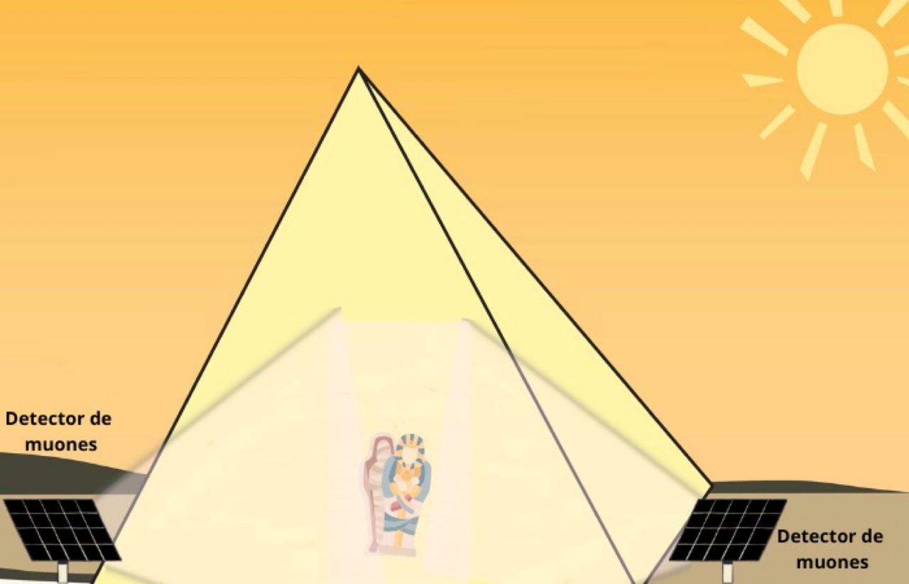 Figura 3. Los detectores de muones ubicados debajo de una pirámide o en sus costados capturan los muones que la atraviesan, lo que ayuda a generar una imagen de la estructura interna de la pirámide. Imagen inspirada en Imagenología muónica de una pirámide mediante dos detectores (Infografía: A. Vlasov/OIEA) [10].