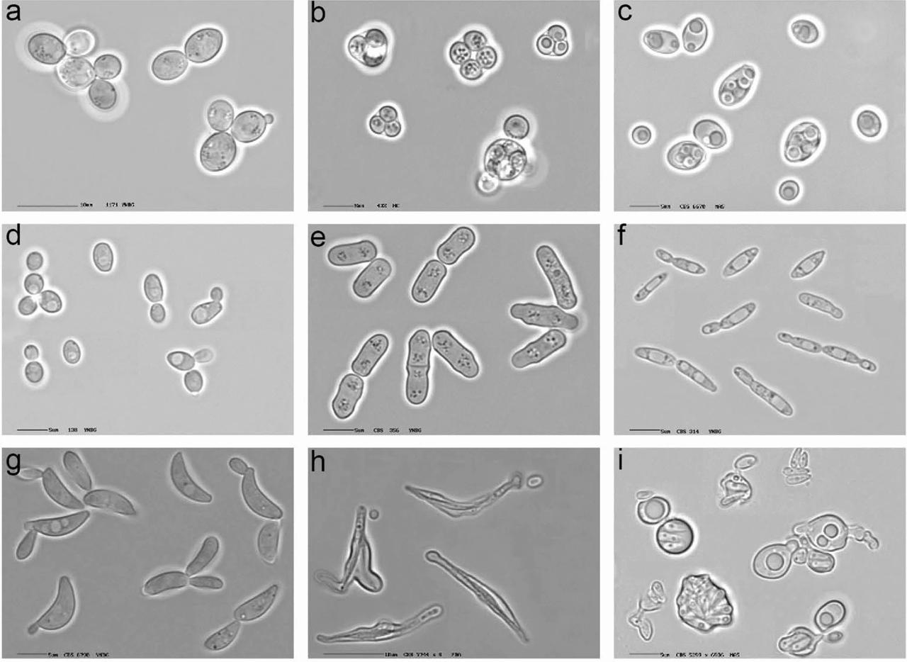 Figura 1. Diversas formas de levaduras en división. (a) Saccharomyces cerevisiae en gemación; (b) Saccharomyces paradoxus en reproducción por meiosis; (c) Pichia scutulata con ascoesporas; (d) Candida glabrata en gemación; (e) Schizosaccharomyces pombe en fisión; (f) Hanseniaspora uvarum en gemación; (g) Metschnikowia lunata; (h) Metschnikowia agaves en reproducción por meiosis; (i) Clavispora lusitaniae en reproducción por meiosis. Figura tomada de Boekhout et al., 2022.