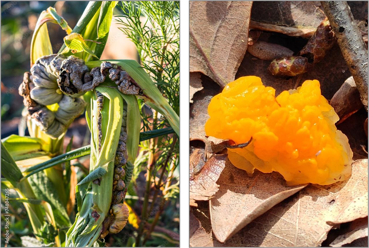 Figura 2. Izquierda, huitlacoche creciendo en el maíz (Foto: Adobe Stock). Derecha, cuerpo fructífero de Tremella creciendo en el bosque (Foto de C. Martínez-Anaya).