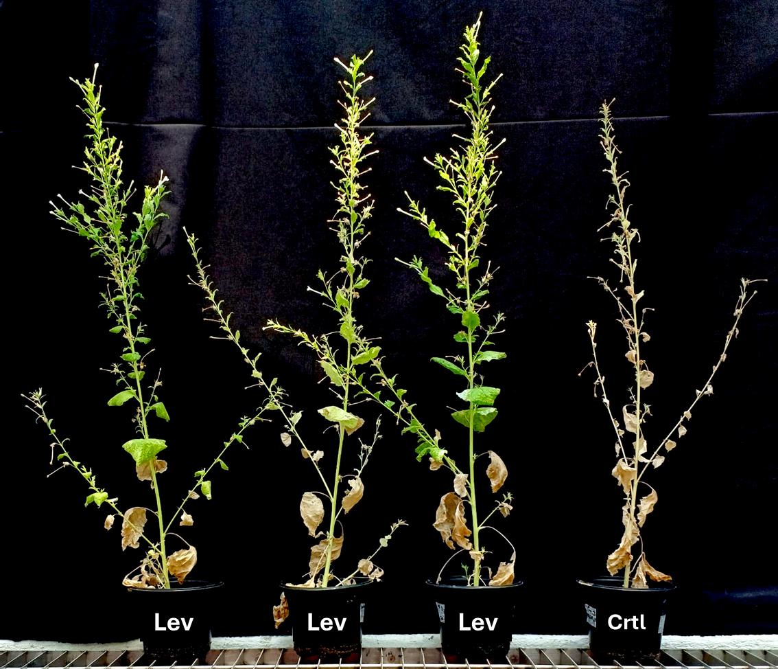 Figura 3. Plantas de Nicotiana benthamiana (una solanácea usada comúnmente como modelo de estudio a nivel de laboratorio), infectadas con un nemátodo fitopatógeno del nudo o agallador (Meloidogyne enterolobii). Las primeras tres plantas a la izquierda fueron inoculadas con nuestra levadura antes de la infección, mientras que la de la derecha no. Al final del experimento se logra ver como la planta no tratada no resistió la infección y se marchitó, pero las que recibieron a la levadura sobrevivieron más tiempo produciendo flores. Foto tomada por I. Tapia Vázquez.