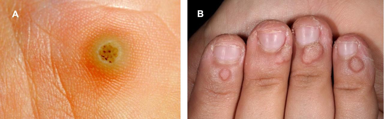 Figura 2. Verrugas causadas por papilomavirus. A, verruga en la planta del pie (https:// podoxativa.com/verrugas/); B, verrugas alrededor de las uñas (https://dbdermatologiabarcelona.com/verrugas/).